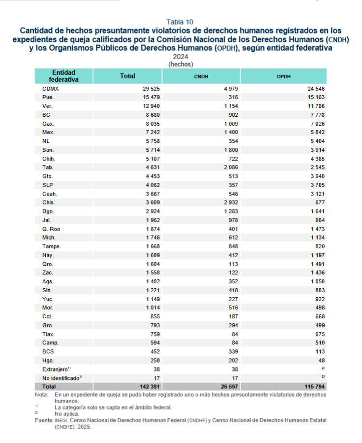 A nivel nacional, la entidad donde presuntamente se vulneraron más los derechos humanos de las personas quejosas o agraviadas fue la Ciudad de México, con 29 mil 525 hechos. Le siguieron Puebla, con 15 mil 479, y Veracruz, con 12 mil 940, concentrando estas entidades las cifras más altas de hechos presuntamente violatorios registrados tanto en los expedientes calificados por la CNDH como en los de los organismos públicos de derechos humanos estatales.